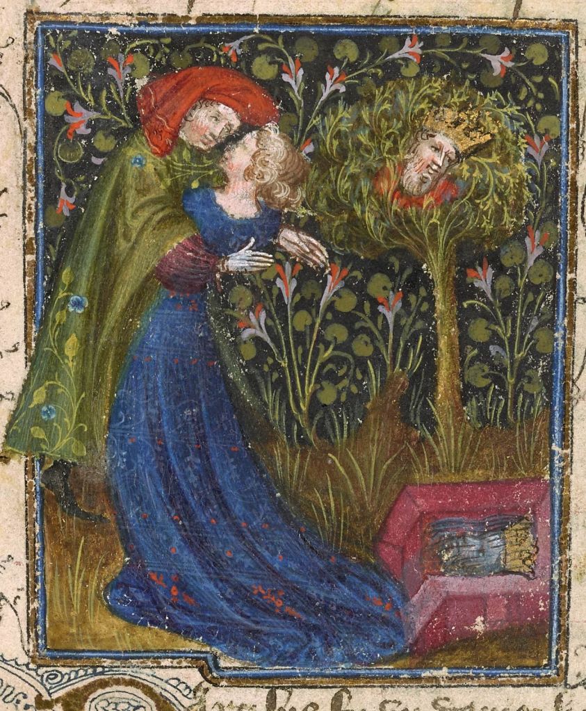 For the moral, it seems but a hop, skip and jump to The Romance of the Rose and the rose as a perennial symbol of budding romance. However, a quick delve into the rose’s associations for writers in the Middle Ages reveals it to be a much thornier subject than might be expected. It’s not the scope of this entry to give a potted history of the rose’s varied (or variegated?) place in medieval culture but I’m indebted to Mia Touw’s essay on the topic for much of my information on this. For some ascetic church fathers of the early Middle Ages, the rose represented worldly luxury and sensual indulgence (tied perhaps to the stories of all the rose petals strewn at the more decadent parties of the late Roman Empire). For others, the thorns came to symbolise the mortification of the flesh and an example of Christ’s suffering, while its flowers became an image of divine compassion.