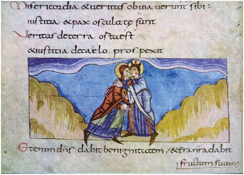 Psalm 85: Righteousness and Peace kiss each other (detail from the 9th century Stuttgart Psalter)