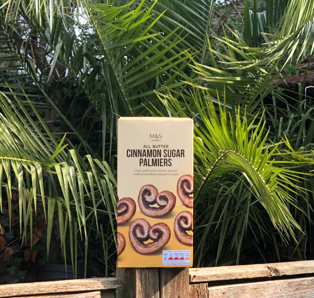 You’ll have gathered I haven’t had much time for biscuit blogging lately but I couldn’t let this Holy Week pass without writing an entry… In this case, a biscuit with a link to the triumphal entry in the gospels, the event that signals the beginning of Holy Week in the Easter story and which is marked as Palm Sunday in Anglican, Catholic and Orthodox tradition. While there are no biscuits associated with Palm Sunday that I know of I thought it might be a good opportunity to write about these Cinnamon Sugar Palmiers. So here they are in their smart (M&S, no less) box perched on the fence overlooking a neighbour’s palm.
