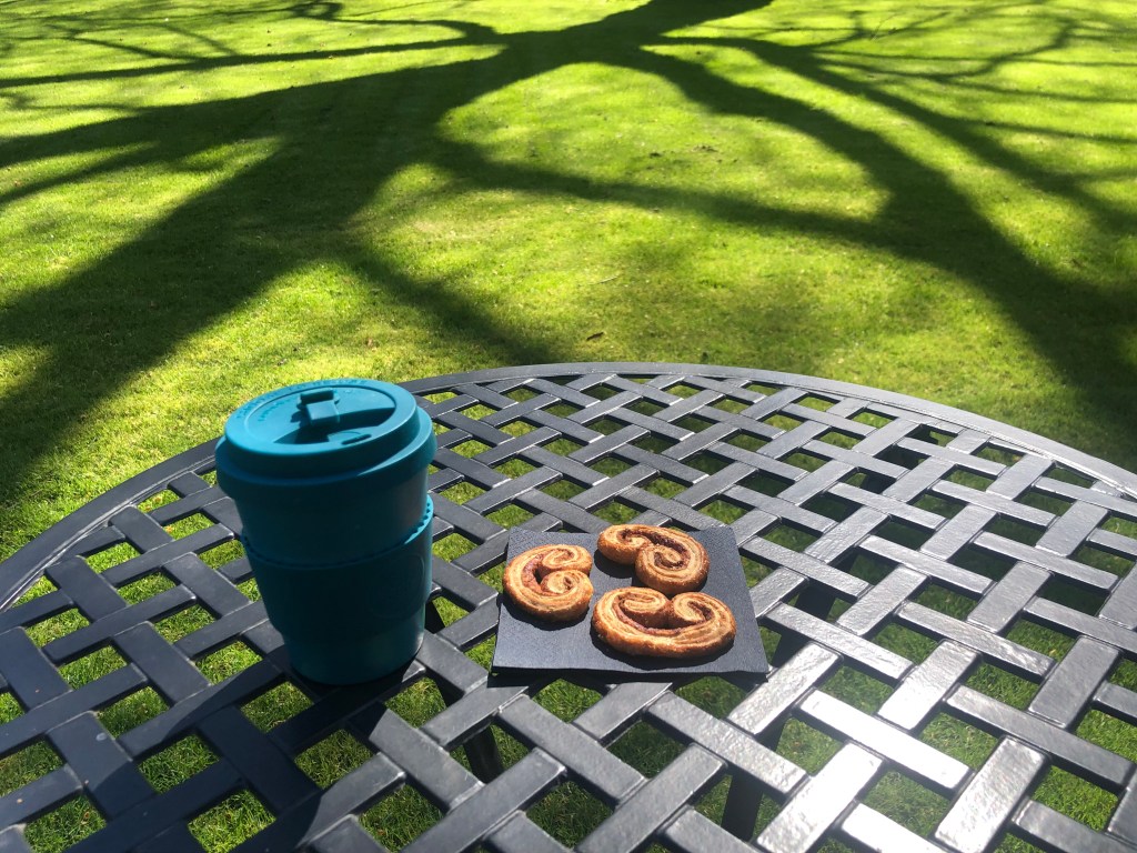 So what are these Palmier biscuits like? Well, they taste exactly as you would expect them to taste: a smaller, dried version of the sugary-sticky cinnamon pastries that go very nicely with a cup of coffee. They are also small enough that nibbling two or three at one sitting feels justified. I got this lovely, unintentionally artsy, pic of three of them on retreat with me and my portable coffee on Thursday in a single capture: a beautiful sunny day with what felt like heaven’s light dancing in the garden.