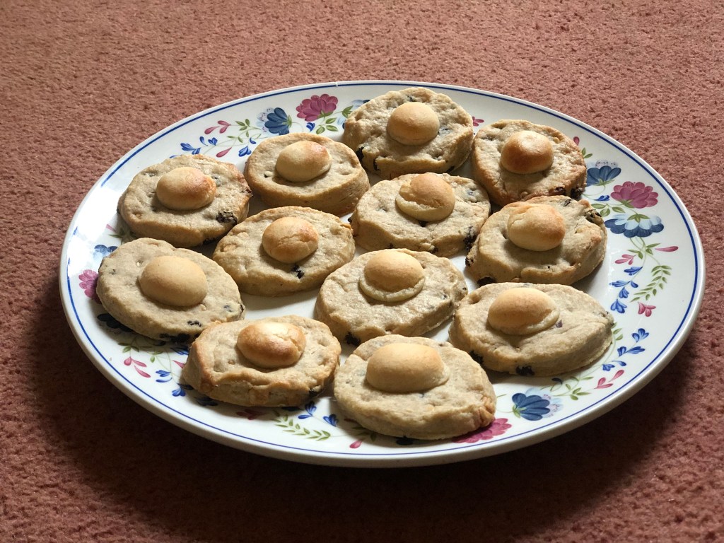 Simnel sounds like a medieval word and it is. Its earliest attested use in the OED is in Havelok the Dane in c. 1300 to mean a high-class cake or bun. The true history of the cake is harder to come by but time-honoured traditional recipes are linked to Bury, Shropshire and Devizes. I took inspiration from another baking blog in adding marzipan to each biscuit as a nod to the Simnel Cake’s decoration with eleven marzipan balls representing the twelve apostles minus Judas (or twelve if you add one in the middle for Jesus).